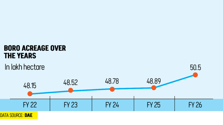 “In contrast, weather during the Boro season has been relatively favourable. As a result, farmers have shown increasing interest in Boro, which is one of the key reasons behind the expansion of land dedicated to it,” he said.