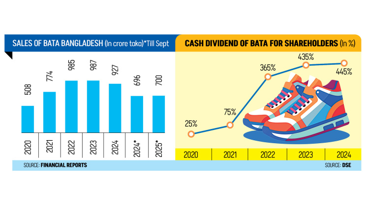 Bata Shoe Company Bangladesh Ltd reported sales of Tk 700 crore in the first nine months of 2025, up from Tk 696 crore in the same period a year earlier. In 2024, the listed multinational declared a 445 percent cash dividend for shareholders.