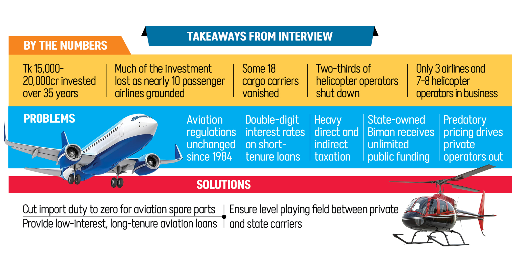 Cumulative investment by entrepreneurs is estimated at Tk 15,000 crore to Tk 20,000 crore, with the airline industry alone accounting for more than Tk 10,000 crore. Much of this investment was eventually lost as nearly 10 passenger airlines were grounded, while cargo carriers and around two-thirds of private helicopter operators were forced to shut down after failing to absorb sustained losses.