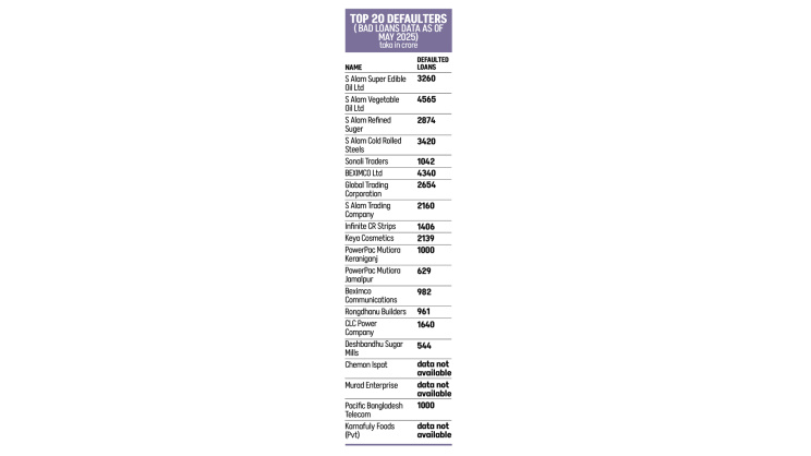 Among S Alam Group companies on the top defaulters list, Sonali Traders had Tk 1,042 crore in bad loans; Global Trading Corporation Tk 2,654 crore; S Alam Trading Company Tk 2,160 crore; and Infinite CR Strips Industries Tk 1,406 crore until May last year.