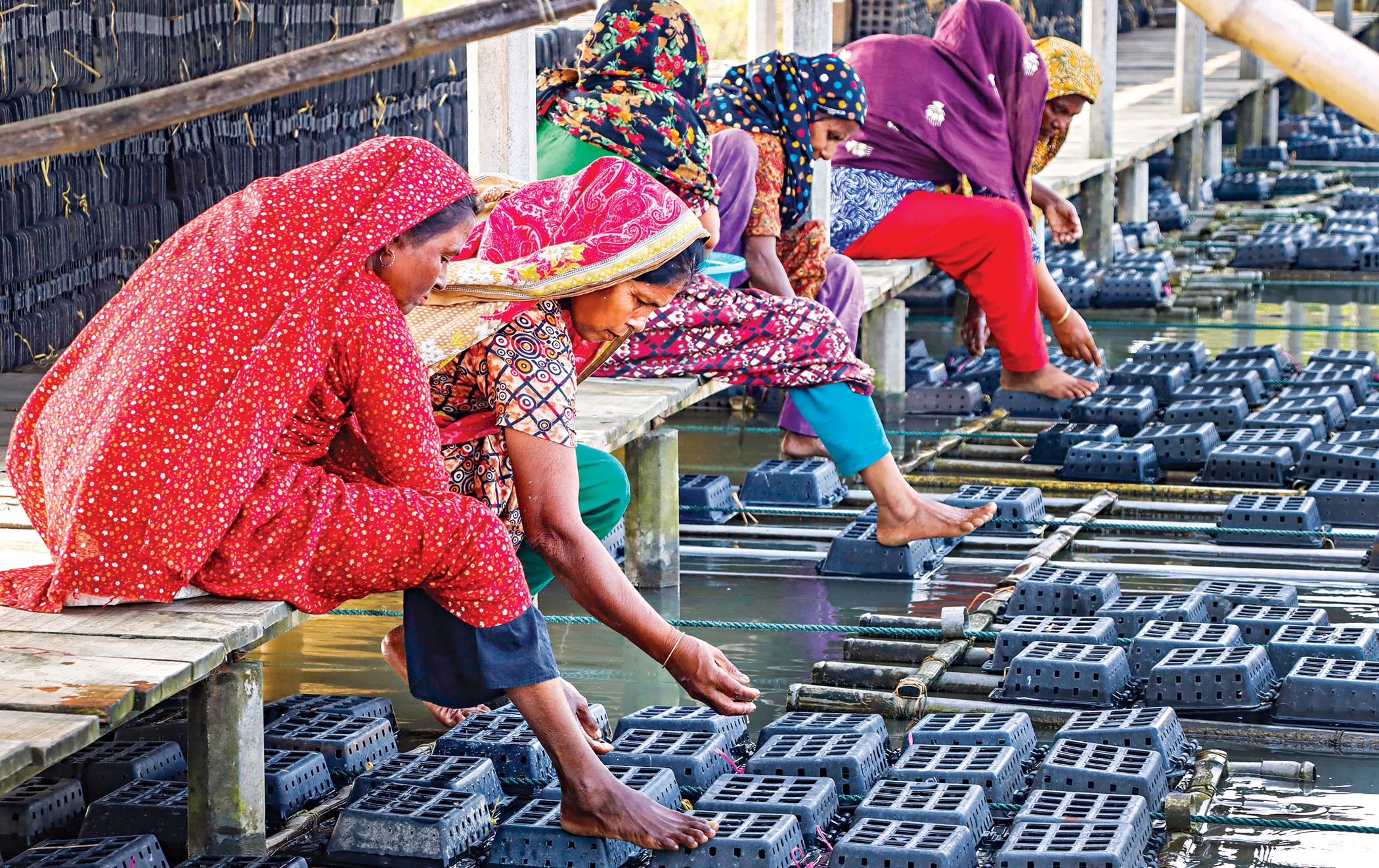 Women at a Shyamnagar soft-shell crab farm carefully tend individual crabs in floating cages, managing water and feeding to ensure healthy moulting, forming a vital part of the workforce. The photo was taken recently.