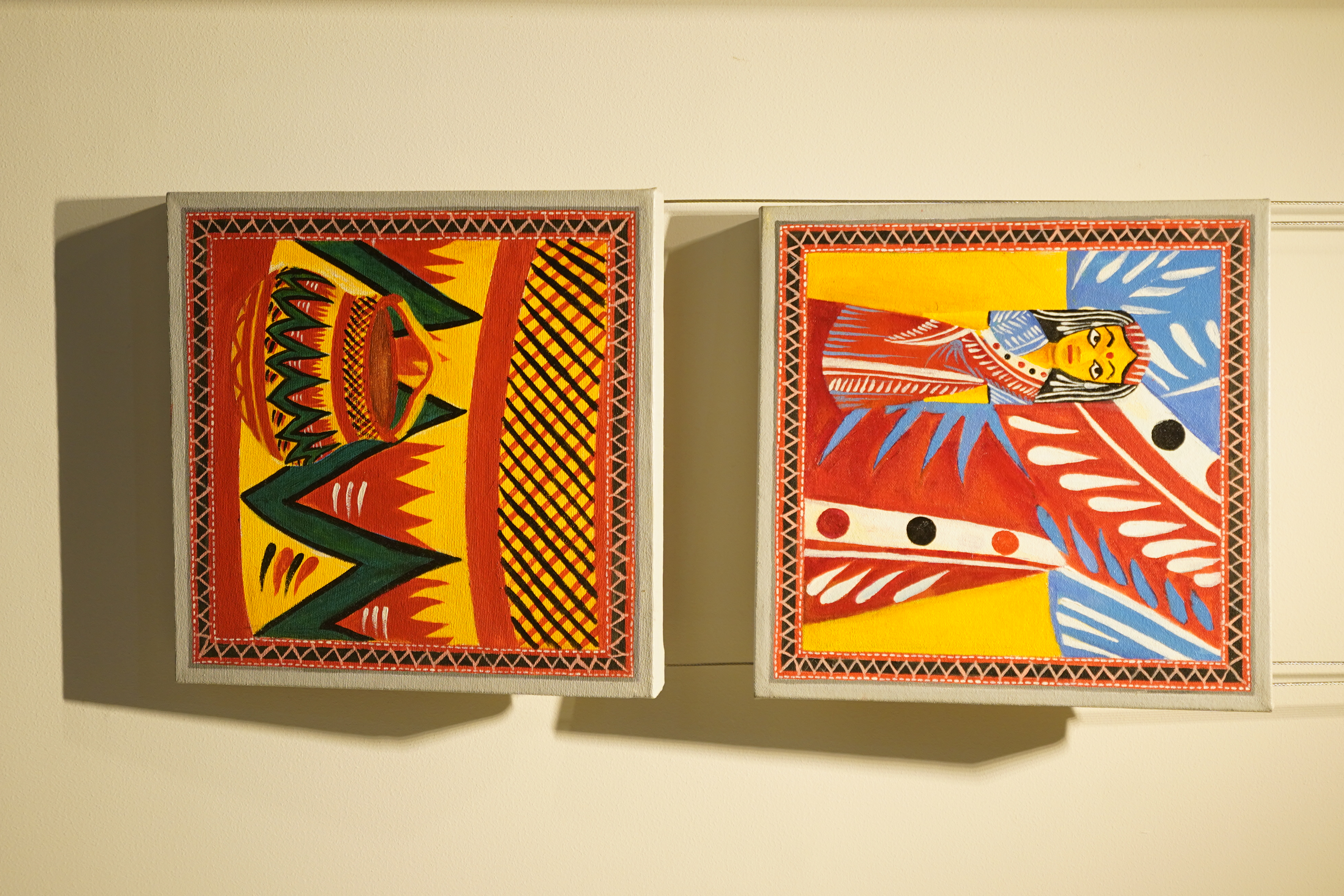 Other than this, masks and mural-like compositions draw on forms associated with folk performance, festive public art, and the visual exuberance of the Bengali New Year season, echoing the language of procession, fairground craft, painted surface, and ceremonial reinvention of Pahela Baishakh. Nafies treats these folk-derived imagery as active visual material.