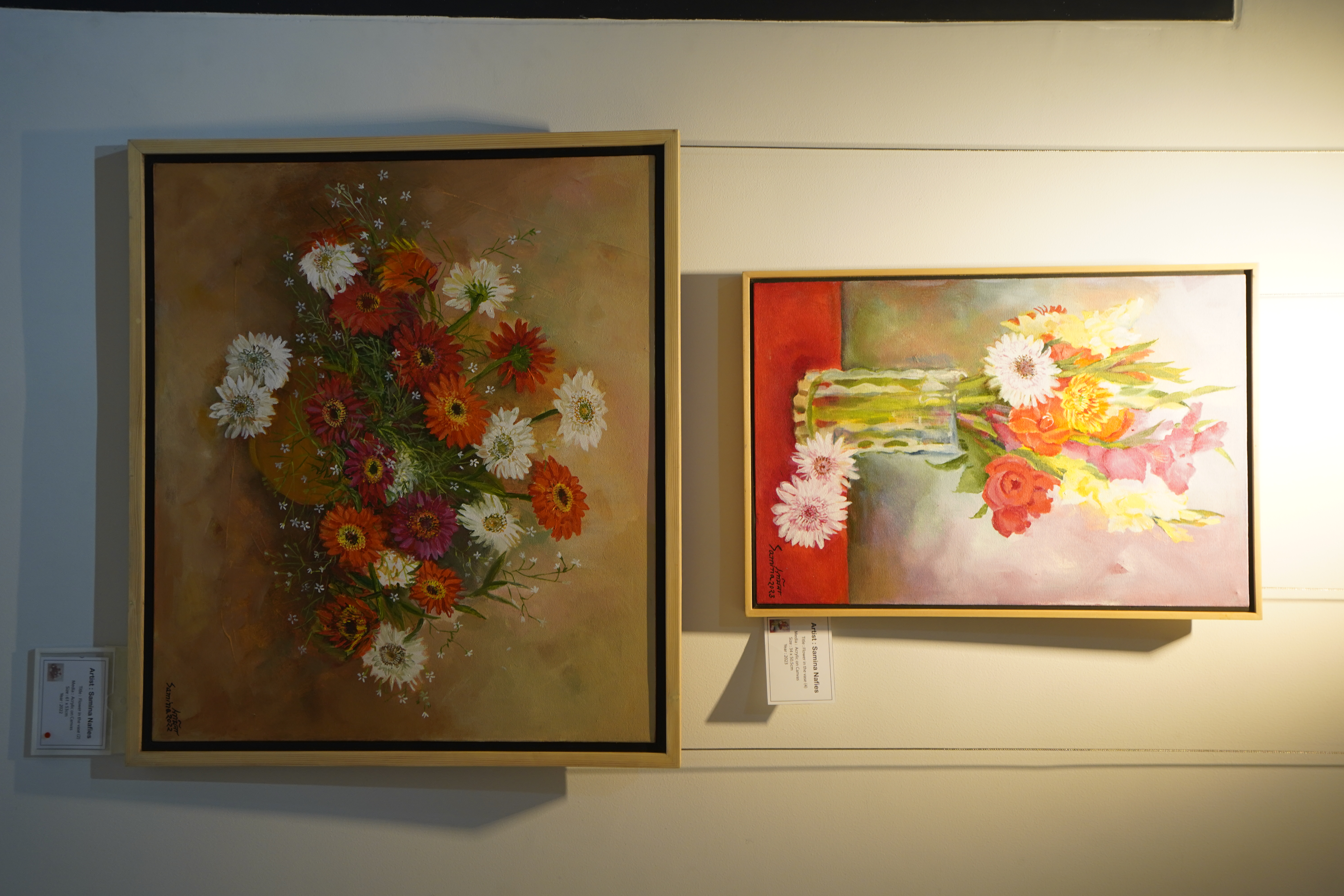 Nafies belongs to a generation of Bangladeshi artists for whom painting has often remained in conversation with pedagogy, literature, public culture, and the social life of images. Her earlier career includes several solo exhibitions in Dhaka, along with participation in National Art Exhibitions and Asian Art Biennials. She has also appeared in international group exhibitions, including a Bangladeshi women artists’ exhibition at Rogue Space in Chelsea, New York, in 2017.