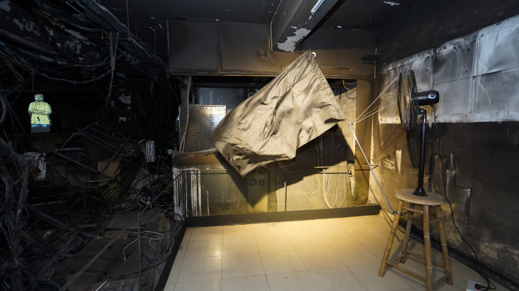 In one installation, pigeons move freely across a fire-damaged floor, navigating desks and scattered remnants. Their presence suggests continuity amid disruption, a living counterpoint to destruction.