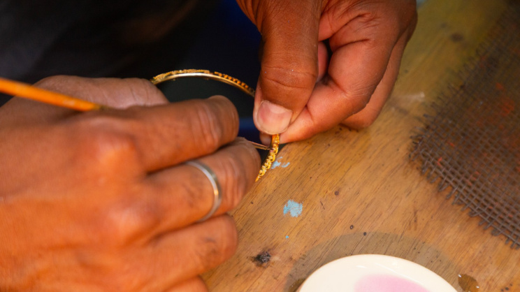 The first is melting. Raw gold or silver is heated and reshaped into sheets or wires. The second stage involves initial design, where form and proportion are defined. The third stage uses dies –tools that allow intricate designs to be replicated with consistency. The final stage is finishing, known as Meenakari, or Minakari, where polishing, filing, and colouring complete the piece.