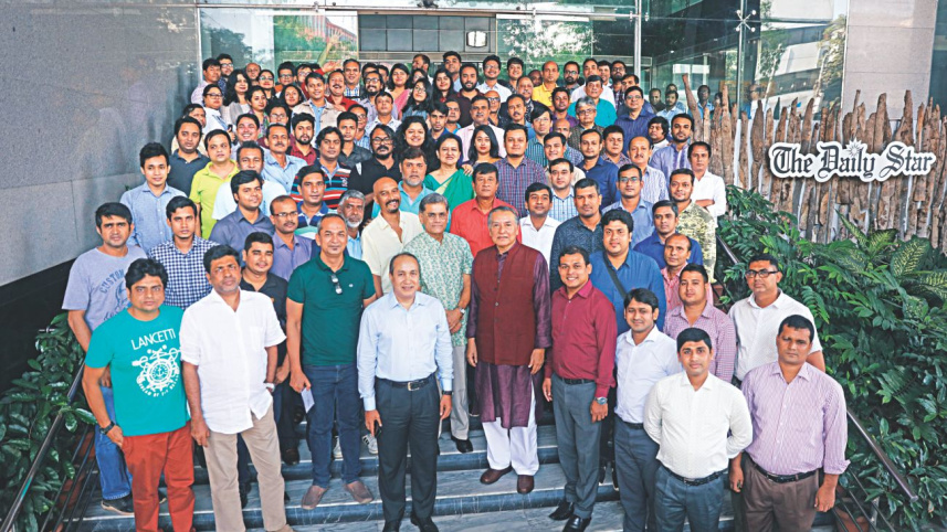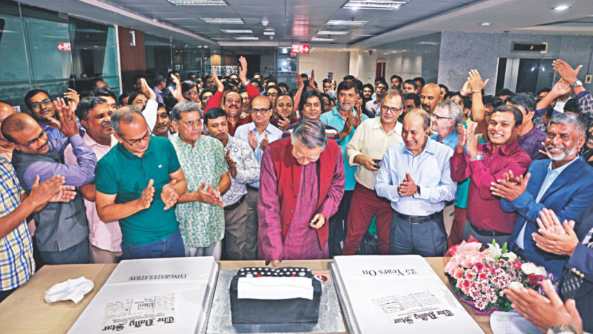 Mahfuz Anam, editor and publisher of The Daily Star, with his colleagues at The Daily Star premises yesterday. Photo: Rashed Shumon In celebration of his 25 years as editor of the daily, a cake was also cut. Photo: Rashed Shumon