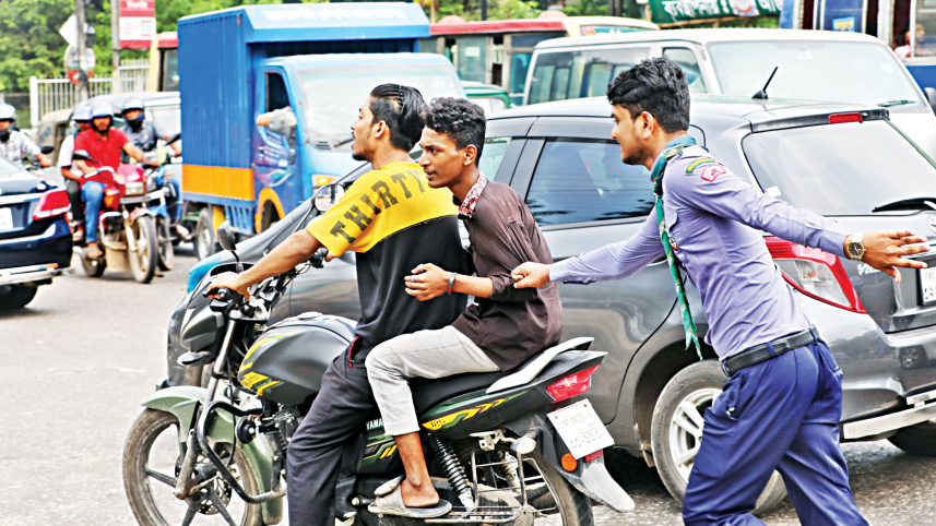 A student chases a motorcycle as the rider and passenger cruise through the street without any helmets, a clear violation of traffic law. Under a new initiative, the government is planning to formally include 300 students in the capital’s traffic management system. Students will work alongside police officers to assist in regulating traffic. The photo was taken on Mirpur Road yesterday. Photo: Prabir Das
