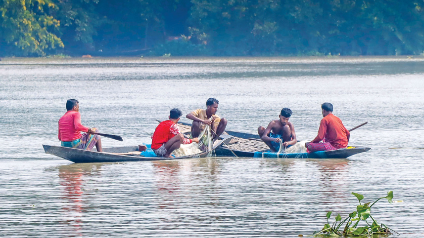 A group of fishermen catching hilsa on the Atai river in Abhaynagar upazila of Jashore. Despite a ban on catching hilsa during the breeding season from October 13 to November 3, these fishers allege that inadequate food support from the government has left them with no choice but to return to fishing. The photo was taken yesterday. Photo: Habibur Rahman