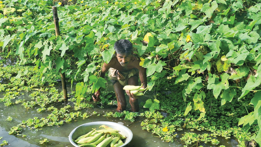 A farmer harvests dhundol (sponge gourds), which is cultivated in shallow water bodies like this. He will take his bounty to a weekly market and sell them for Tk 40 per kilogramme. The photo was taken in Pormahal village of Jhalakathi yesterday. Photo: Titu Das