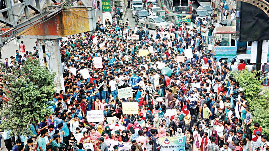 Students of seven colleges affiliated with Dhaka University demonstrate blocking the capital’s Science Lab intersection yesterday demanding scrapping of DU affiliation and merger of their colleges into a new independent public university. The demo led to severe traffic congestion in and around the Science Lab area. Photo: Star