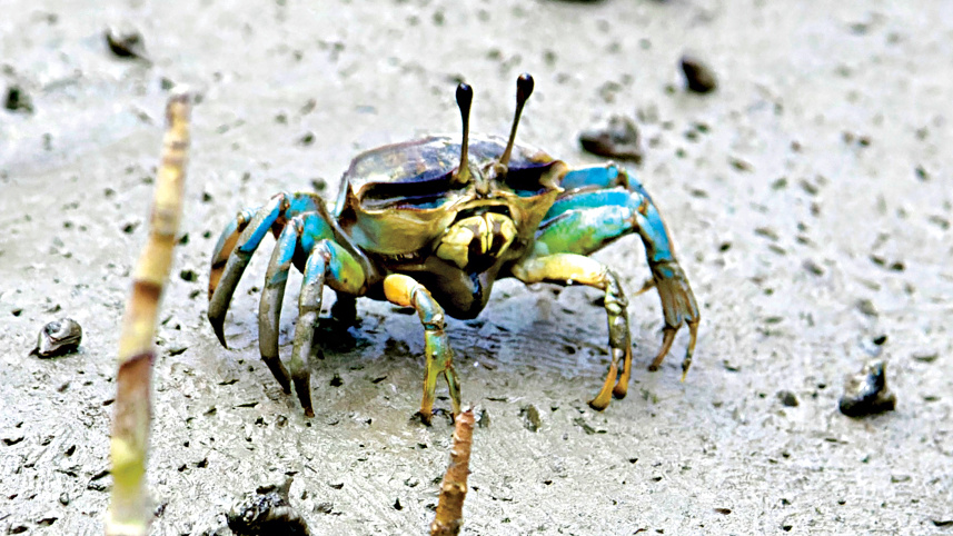 FIDDLERS OF THE SOUTH A female Blue Fiddler Crab, or Calling Crab, spotted on a sandy beach of the Sundarbans. What differentiates a female of this crab species from the male is the size of the claws. While a female has symmetrical ones, a male has one claw much larger than the other. And that is where it gets its name! When the males move the larger claw while communicating, mating, feeding, or fighting for dominance, it looks like they are playing the fiddle. They are found in mangroves, salt marshes or sandy and muddy beaches across the world. Like all crabs, the Fiddlers also shed their shells as they grow and prefer to remain in hiding until their new shells are hardened enough. However, they live a considerably brief life, spanning up to only two to three years. They are the least threatened species of crabs. PHOTO: TIMU HOSSAIN