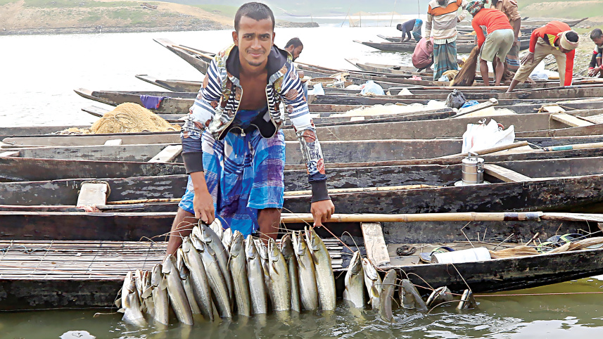 A fisherman flaunts his haul of freshly caught fish at a waterbody in Borni area of Sylhet’s Companiganj upazila. With water levels going down, fishermen of the upazila are rushing to catch as many fish as possible. They sell the fish at a market next to the Sylhet-Companiganj Road, from where traders purchase and send them to markets across the country. PHOTO: SHEIKH NASIR