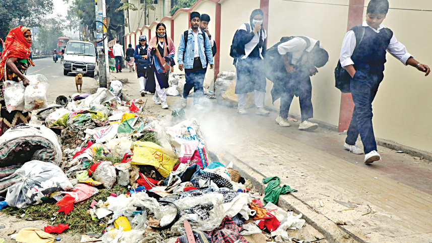 A schoolboy is bent double from coughing, while his fellow students are trying to swerve away from the smoke emitting from a burning pile of garbage near a footpath in the capital’s Satmasjid road yesterday noon. Not only is the road littered with open garbage, the trash is set on fire, releasing toxic smoke into the air. However, the authorities concerned seem to remain oblivious towards the harm such acts cause to the environment and the people. PHOTO: PRABIR DAS