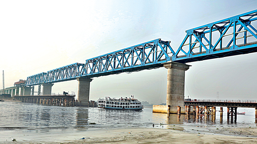 The first railway bridge over the Buriganga is being constructed in Aliganj area of Narayanganj. The rail line will connect the capital with Padma Bridge and the authorities are aiming to operate trains on it by next June. Photo: Anisur Rahman