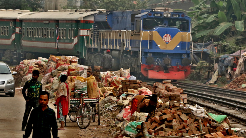 RISKY BUSINESS... Some people have occupied both sides of the rail track from Malibag to Khilgaon and are engaged in brick breaking works. Such endeavours so close to the rail lines can cause an accident within a blink of an eye. This photo was taken in Malibag recently. Photo: Anisur Rahman