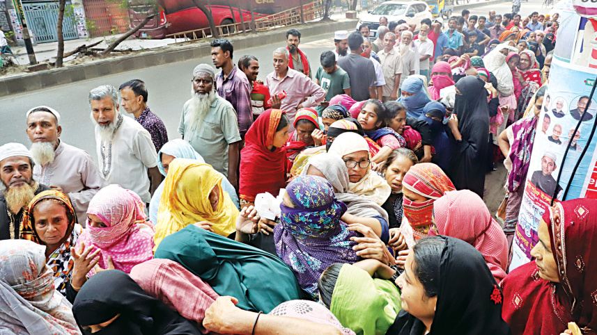 People jostle in queues while waiting for their share of daily commodities at subsidised prices from an OMS truck in the capital’s Rampura yesterday. With prices soaring in the markets, the desperation for cheaper essentials has been growing among the low-income groups. PHOTO: SHEIKH ENAMUL HUQ