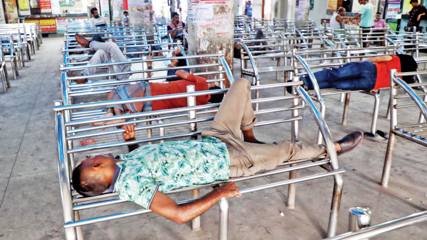 Bus-counter employees taking a nap on empty benches of Mohakhali Bus Terminal as there were hardly any passengers yesterday due to the nationwide blockade. PHOTO: PRABIR DAS