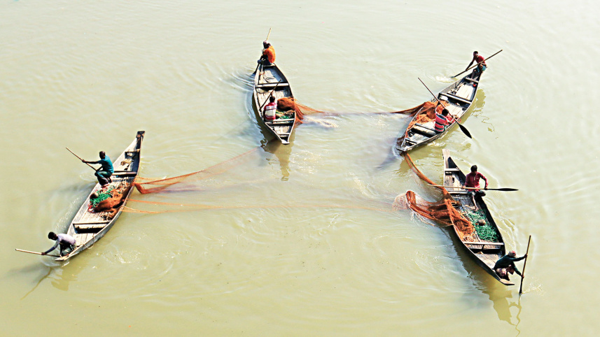 Fishermen of Sylhet’s Gowainghat upazila casting their nets into the Piyain river yesterday. However, they say they have not been getting enough fish due to pollution and erosion in the river. Some of them said they solely depend on this river for their livelihoods. PHOTO: SHEIKH NASIR