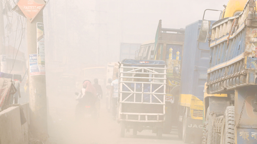 Commuters pass through the dust flying over a broken road in the capital’s Shyampur yesterday. Dust pollution is known to intensify significantly during the winter, making people more prone to respiratory diseases. PHOTO: AMRAN HOSSAIN