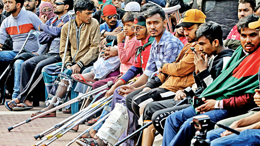 Those injured in the July uprising, among others, attending a rally organised by the Jatiyo Biplobi Parishad at the Central Shaheed Minar yesterday to demand the removal of fascism and a new constitution. PHOTO: ANISUR RAHMAN