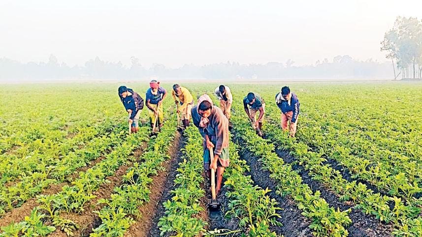 Even in the biting cold, these farmhands have no option but to wake up in the early hours and get to work at the potato field so that they can ensure the day’s paycheck to sustain their families. The photo was taken at Balapara village in Rangpur city yesterday around 7:30am. PHOTO: KONGKON KARMAKER