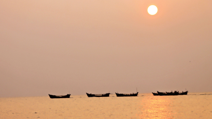 As the sun begins its descent on the horizon, casting a warm golden hue across the sky, the tranquil waters of Kuakata beach shimmer with its reflected light. Amid this, a line of engine-powered boats, manned by fishermen from nearby coastal villages, prepares to set out for an evening of fishing. The photo was taken yesterday. Photo: Titu Das