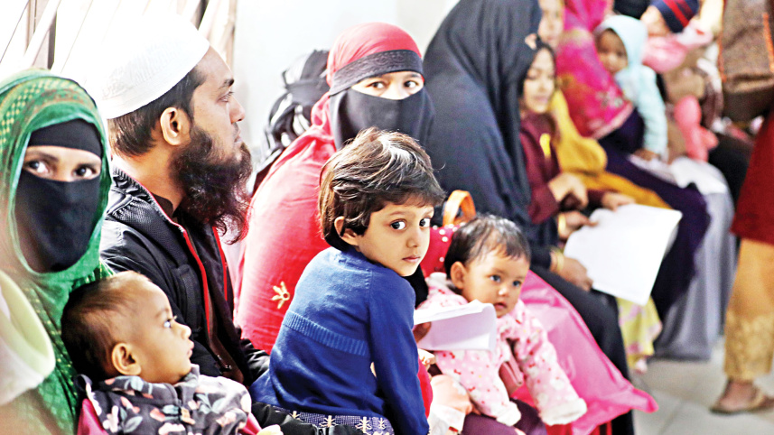 Parents waiting with their sick children at the Dhaka Shishu Hospital yesterday. According to doctors, the hospital sees around 60-70 new patients every day, most of them suffering from pneumonia, diarrhea and other cold-related illnesses. PHOTO: PRABIR DAS