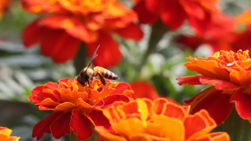 A little bee meticulously extracts nectar from a marigold flower. This delicate process is just the beginning of the remarkable journey in crafting honey. The photo was taken at Alankarkathi village in Pirojpur recently. Photo: Titu Das