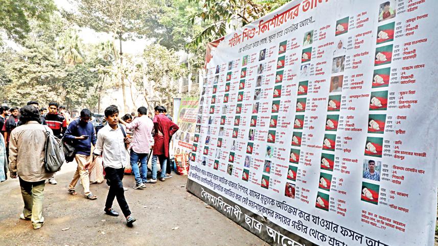 This banner lists all the children and young people killed during the July-August mass uprising last year. The banner was placed in front of the Dhaka University library yesterday by the Anti-discrimination Student Movement, as part of their initiative to honour all of the martyrs. Photo: Prabir Das