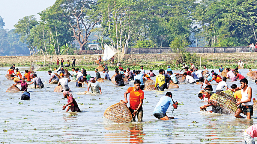 Locals catching fish in Gowahari Beel, a water body, in Sylhet’s Bishwanath upazila on the occasion of Polo Bawa Utshab, a traditional fishing festival held on the first day of the Bangla month of Magh. They started gathering there from morning and then went into the knee-deep water with polos (bamboo-made fish traps). Photo: Star