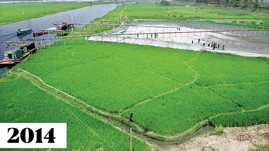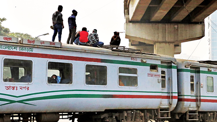 People travelling on the roof of a train, putting themselves in harm’s way. Many get on the roof of carriages mainly to travel for free. The authorities seem to be doing not enough to stop this. The photo was taken at Dhaka’s FDC level crossing yesterday. Photo: Palash Khan