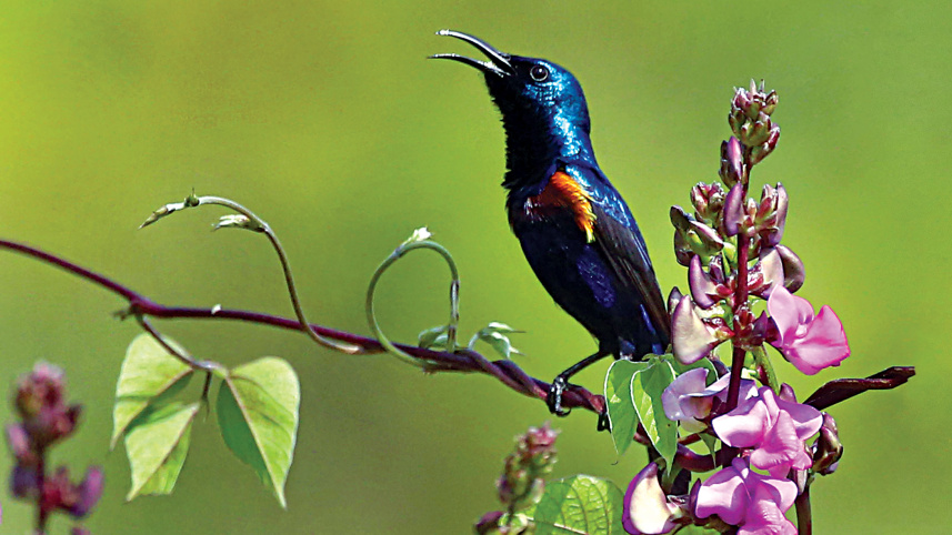 Sapphire With Wings A male purple sunbird singing to its heart’s content in the Baroiyadhala National Park in Chattogram’s Sitakunda. Found mainly in South and Southeast Asia, this stunning bird’s range also extends into parts of the Arabian Peninsula and is a resident in most of its range. Even if it does migrate, it would only be due to heavy rain resulting in scarcity of its main source of food – flower nectar. The striking look is only for the males, while the females wear a dull olive colour with a yellow underbelly. Purple sunbirds, like most sunbirds, are not only fast fliers but highly territorial. They join other birds to mob potential predators and aggressively target other species when defending their territories. They are, however, often welcome in gardens and parks and other urban spaces, mostly due to their physical beauty. PHOTO: KOMOL DAS