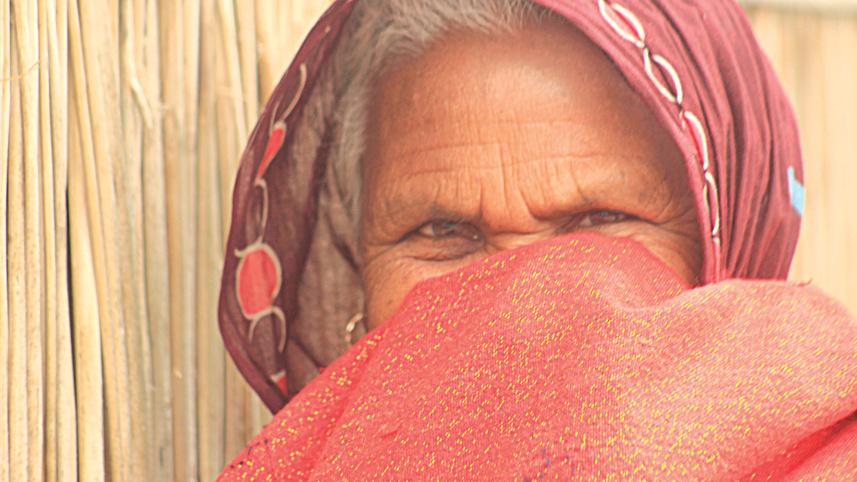Sixty-year-old Sukhiran Bewa covers her face to protect from the chilly winds as she steps outside her small hut in Char Ghughumari on the Brahmaputra riverbed in Kurigram’s Ulipur yesterday. Photo: S Dilip Roy