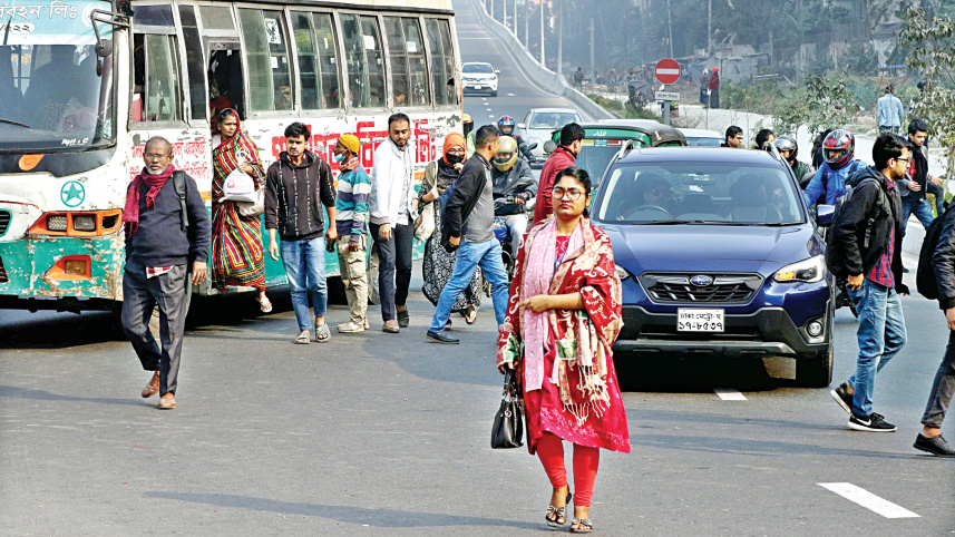 A bus drops off passengers on a ramp of the Dhaka Elevated Expressway in Kakoli intersection area yesterday, obstructing traffic and putting the lives of pedestrians and people in other vehicles at risk. Photo: Prabir Das