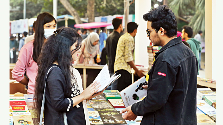 Boi mela is not just for purchasing books, it’s also a place where friends exchange banter over favourite genres and authors. It’s a rendezvous of literary minds, like the two in the photo taken at Suhrawardy Udyan yesterday. Photo: Prabir Das