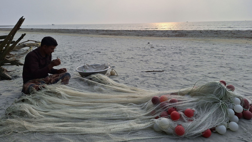Kamal Hawlader mends his fishing nets on the sandy Subha Sondhya Beach in Barguna’s Taltoli area yesterday evening as the sun sets on the horizon. The 48-year-old goes to the sea every evening on his small dinghy, casting his nets till night. He makes about Tk 500-1,000 from selling his catch in the local markets the next morning. Photo: Titu Das