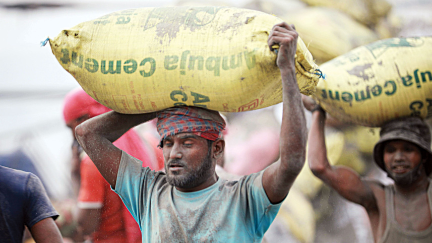 Without any protection, workers unload bags of fly ash from a vessel in Chattogram city’s Sadarghat area yesterday. The labourers are not aware of the health risk involved in inhaling fly ash, a key material for making cement. Fly ash inhalation has been linked to respiratory, heart, and kidney diseases. Photo: Rajib Raihan