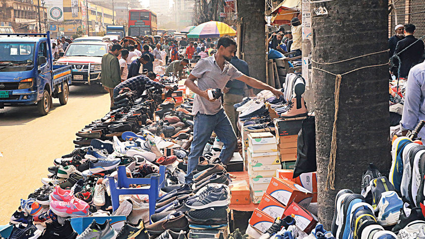 Hawkers occupy the pavement and almost an entire lane of Dilkusha Road in Motijheel, putting pedestrians in difficulty and causing congestion on the road. The photo was taken yesterday. Photo: Amran Hossain
