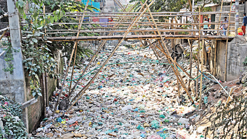 The Jirani Khal has become completely clogged with waste irresponsibly dumped from nearby homes. Due to this, pretty much all year round, residents suffer from waterlogging, health problems, and foul odour. The photo was taken recently in the capital’s Mugdapara area. Photo: Sk Enamul Haq
