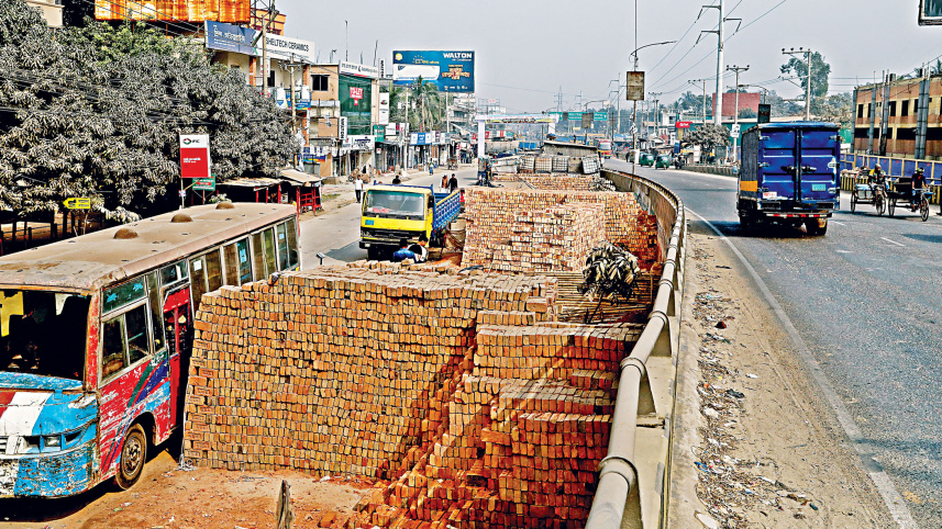 Brick traders occupy a large section of a road next to the Sultana Kamal Bridge in Demra. Commercial vehicles illegally parked there further narrows the road. Photo: Anisur Rahman