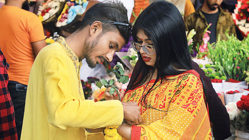 CELEBRATING LOVE AND JOY … A boy helps a girl fix her floral bracelet on the eve of Pahela Falgun and Valentine’s Day. Photo: Amran Hossain