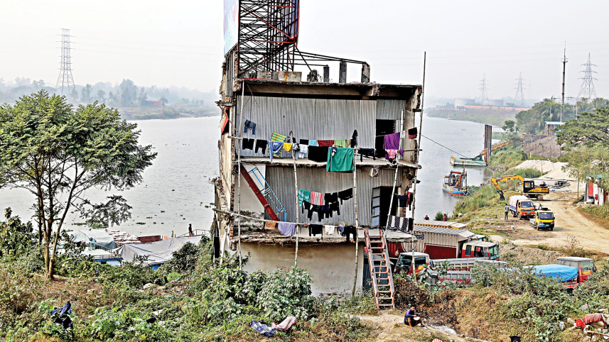 LIVING ON THE EDGE: This particular building was half demolished when the BIWTA conducted a raid against illegal establishments on the Dhaleshwari in Kuchiamara of Keraniganj last year. However, as the rest of it was left untouched, locals began living there despite the risks involved. The photo was taken recently. Photo: Anisur Rahman
