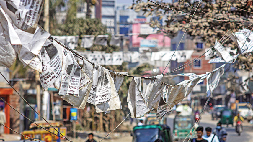 Campaign posters of candidates in the national polls, held on January 7, are still hanging over Washpur-Basila Buddhijibi Road in Dhaka. The photo was taken yesterday. Photo: Rashed Shumon