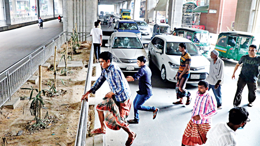 Pedestrians rush towards the median amid speeding vehicles on the capital’s Kazi Nazrul Islam Avenue, risking lives. The photo was taken around 4:00pm yesterday, beneath the MRT station in Karwan Bazar which has a footbridge for crossing over. Photo: Palash Khan