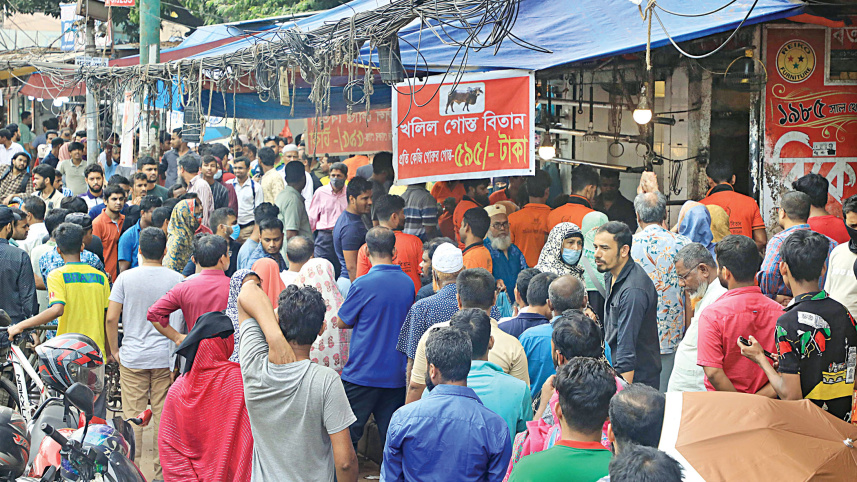 People queue up at a butcher’s shop in Dhaka’s North Shajahanpur to buy beef yesterday. Butcher Khalil draws a huge number of customers every day by selling beef for Tk 595 a kg. Beef is usually Tk 750-780 a kg in kitchen markets of Dhaka. Photo: Amran Hossain