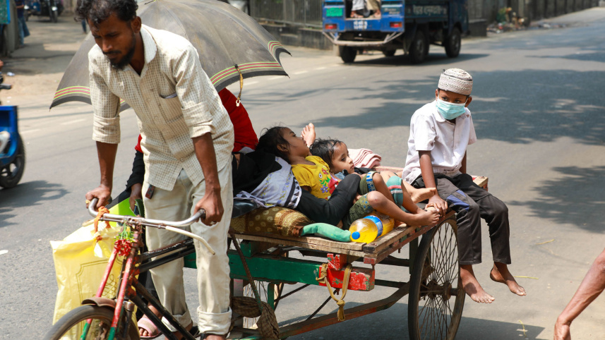Shakil takes his ailing wife and children home from Chattogram Medical College Hospital on a rickshaw-van. A few months ago, his wife had fractured her leg following a fall on a staircase. Despite trying his best, Shakil, a day labourer, was not able to afford further treatment or an ambulance service. The photo was taken in Chattogram city’s Aambagan area yesterday. Photo: Rajib Raihan