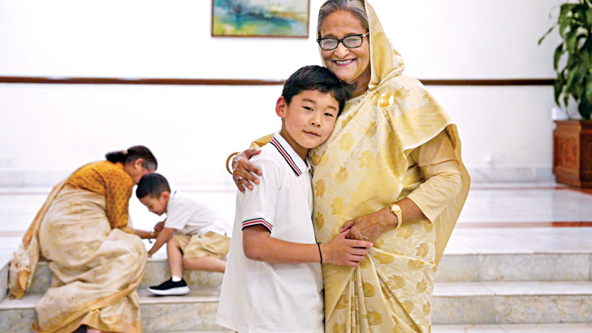 Prime Minister Sheikh Hasina hugs Gyalsey Jigme Namgyel Wangchuck, son of the Bhutanese King Jigme Khesar Namgyel Wangchuck. PM’s sister Sheikh Rehana plays with Gyalsey Ugyen Wangchuck, another son of the king, at the Jamuna State Guest House on Independence Day. Photo: Royal Office for Media, Bhutan