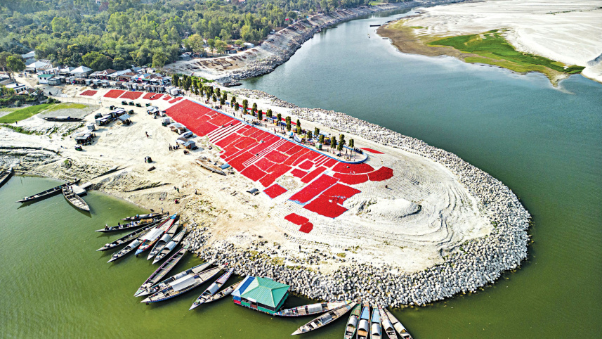RED HOT CHILLI PEPPERS! … Blocks of red stretch across the Kalitola ghat over the Jamuna in Bogura’s Sariakandi upazila as tonnes of red chilli were being dried there recently. Char areas in this upazila and neighbouring Sonatal upazila are famous for chilli, accounting for five percent of the country’s entire chilli production. According to the DAE, around Tk 1,000 crore worth of chilli are being cultivated on about 7,500 hectares of land this year. PHOTO: MOSTAFA SHOBUJ