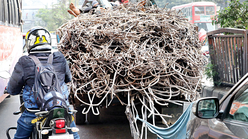 Steel rods being openly carried on a truck with a car trailing right behind in the capital’s Shahbagh. One strong jerk, and the rods could easily slide off and pierce right through the vehicle at the back. Timber and rods are often carried with no precautions in place, increasing the risks of accidents. PHOTO: PRABIR DAS
