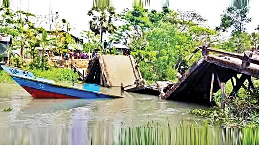This bridge over the Halta canal in Barguna’s Pathorghata upazila collapsed on March 23 after a bulk carrier vessel hit one of its pillars. Residents of two villages on the either side of the canal need to take a detour of about 15km as the authorities are yet to take any initiative to repair the bridge or set up a temporary one. The photo was taken on Saturday. Photo: Sohrab Hossain